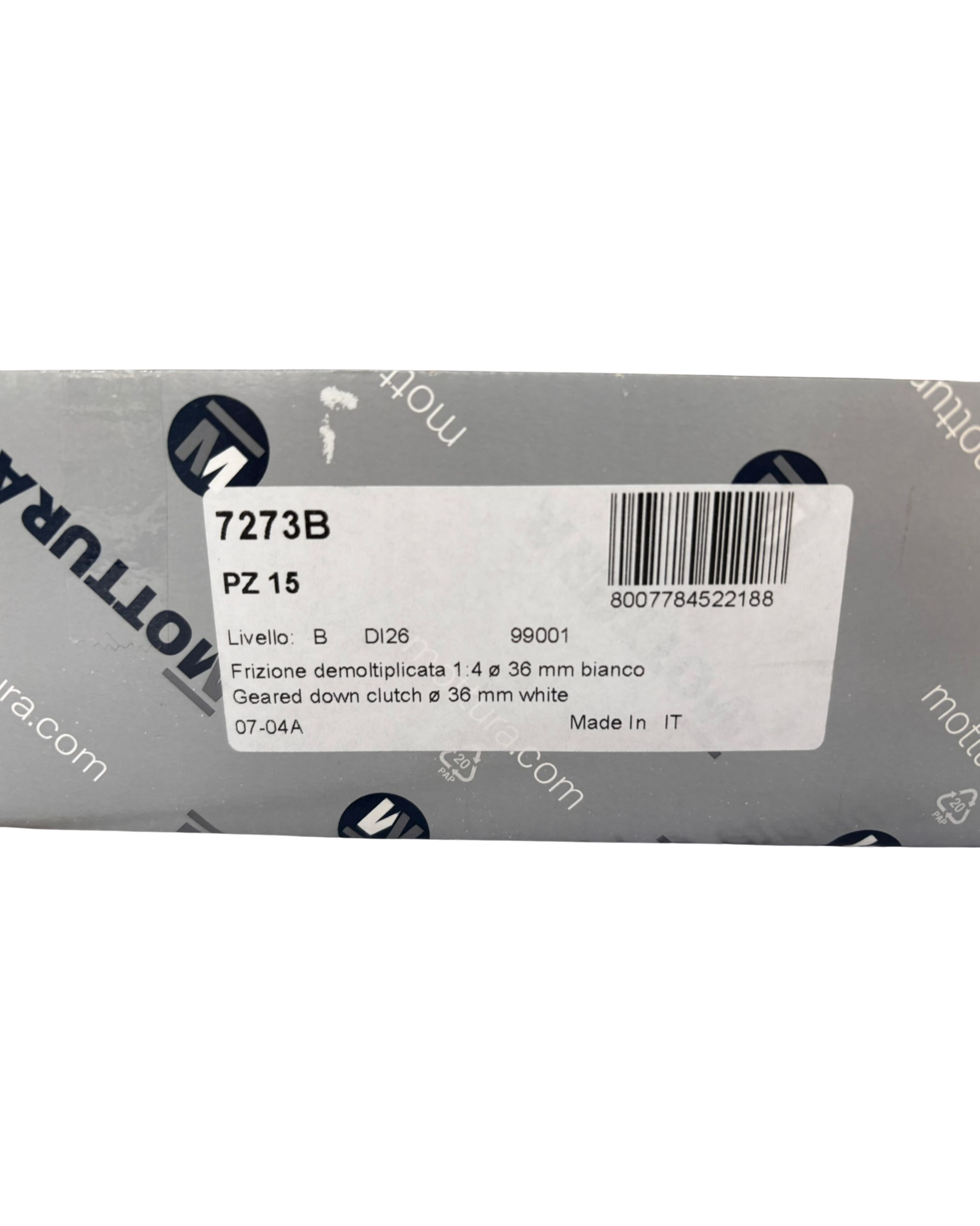 Questo componente, con codice prodotto 7273B, è una frizione demoltiplicata 1:4 di colore bianco, compatibile con tutti i sistemi Mottura a diametro 36 mm.